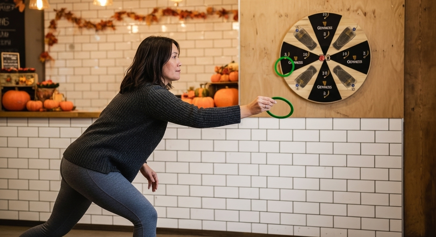 Wall-mounted and pub-friendly, the ring swing game brings a playful element to empty walls while reinforcing your brand through visual presence.