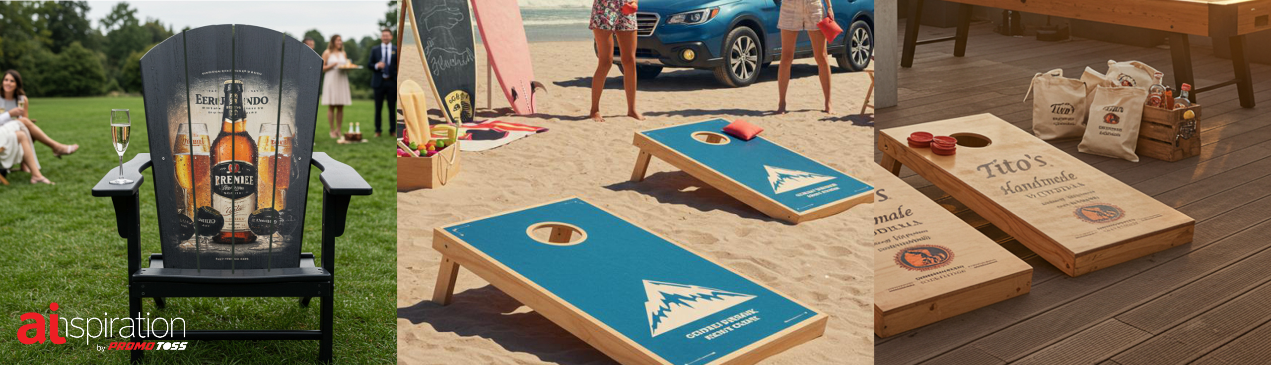 For example, a wood sling chair (custom beach chair) can feature your company logo, while All Weather Fully Loaded sets combine multiple games for hours of branded entertainment. Similarly, Regulation Cornhole and Cornhole Fully Loaded sets offer competition, visibility, and a visually striking presence at outdoor events.