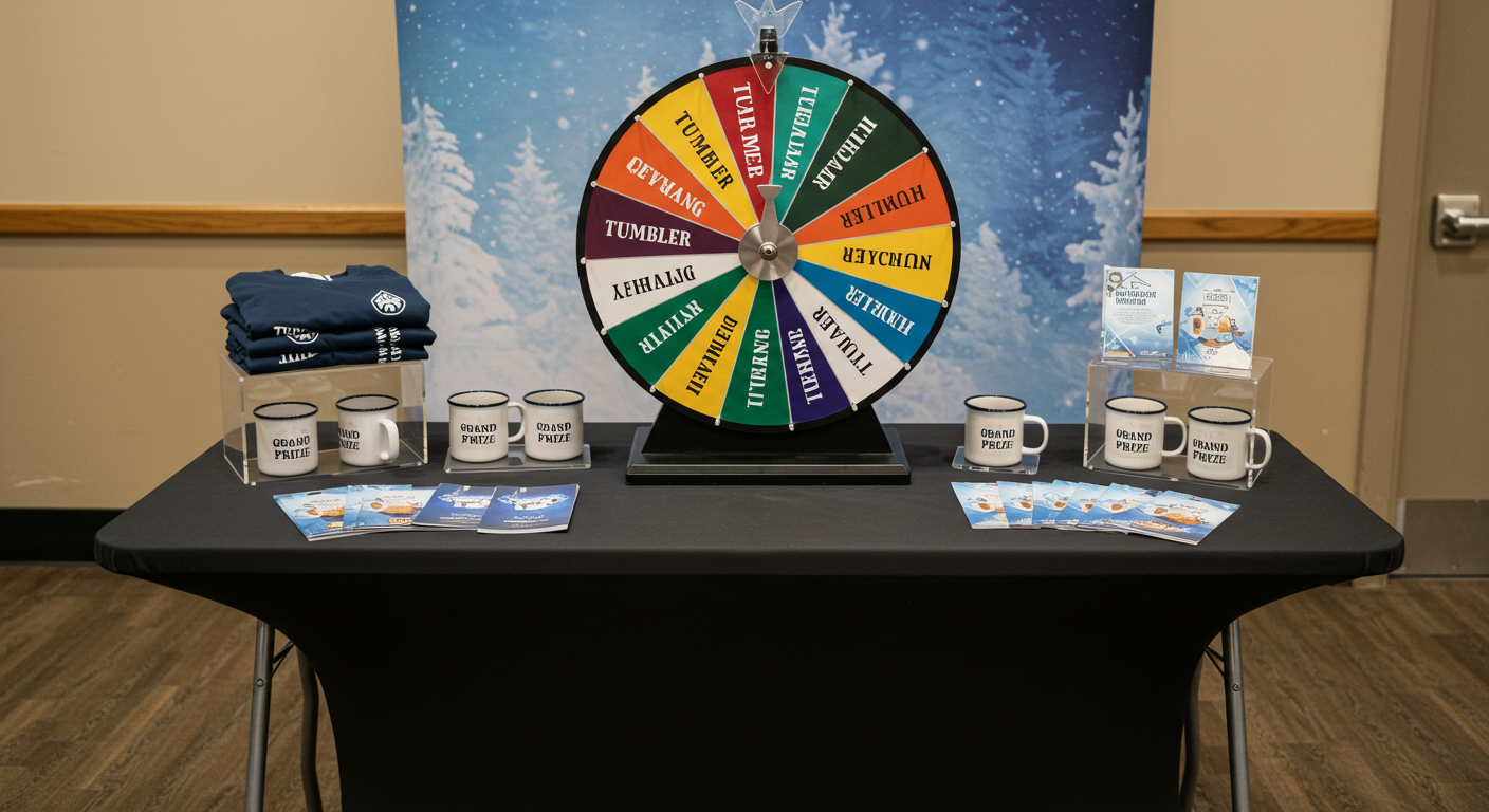 Imagine a cozy, winter-themed indoor booth: branded tabletop curling game, cocoa station, and an incentive wheel tied to CRM entries. It’s visual. It’s interactive. And it works.