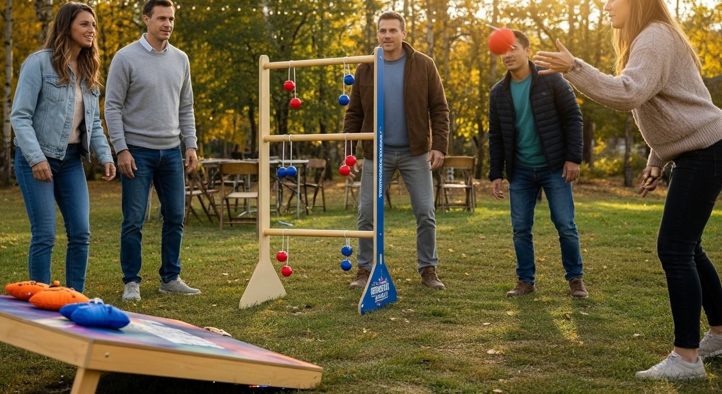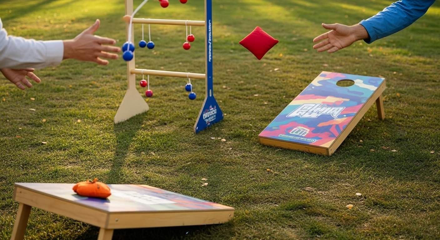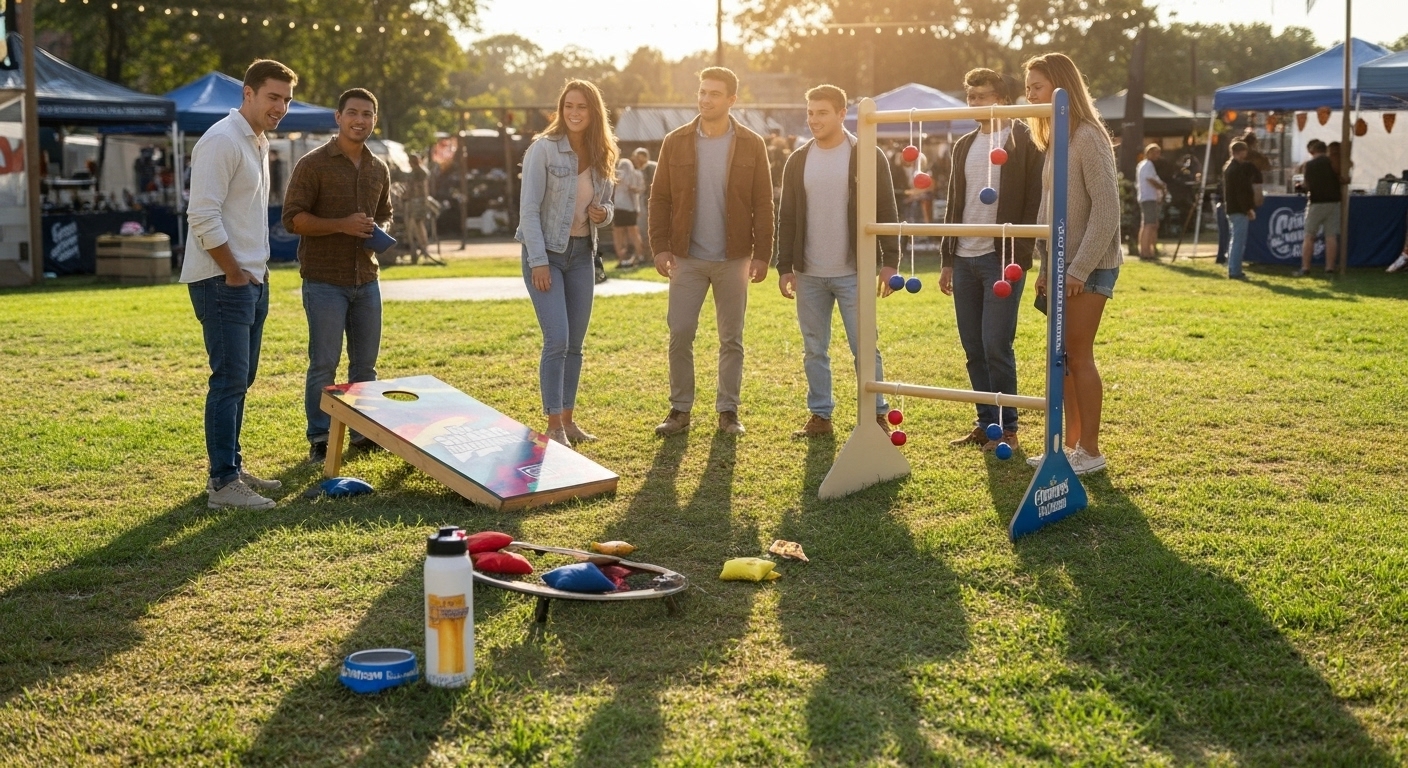 • Custom yard games – Cornhole, ladder toss, or oversized yard games with logos, colors, and messaging provide a memorable hands-on experience.