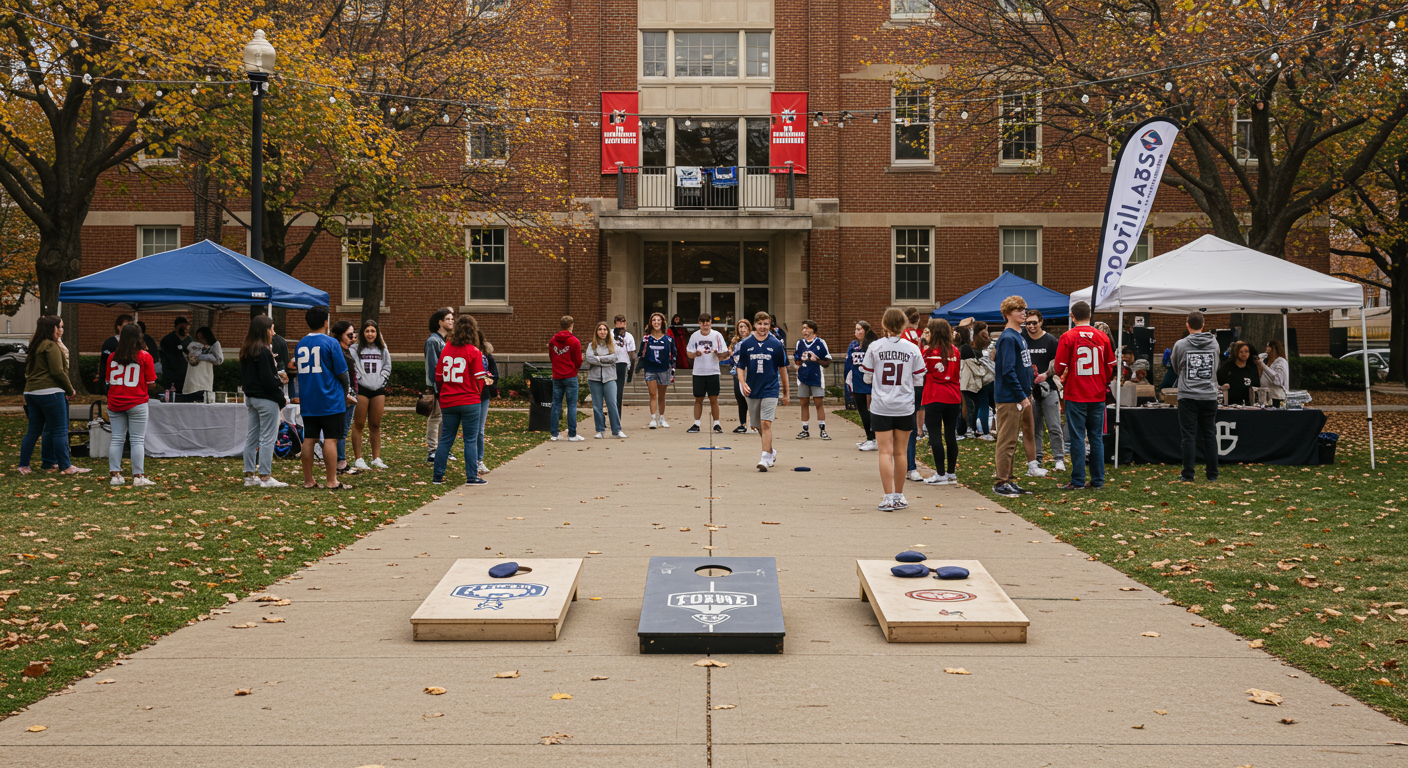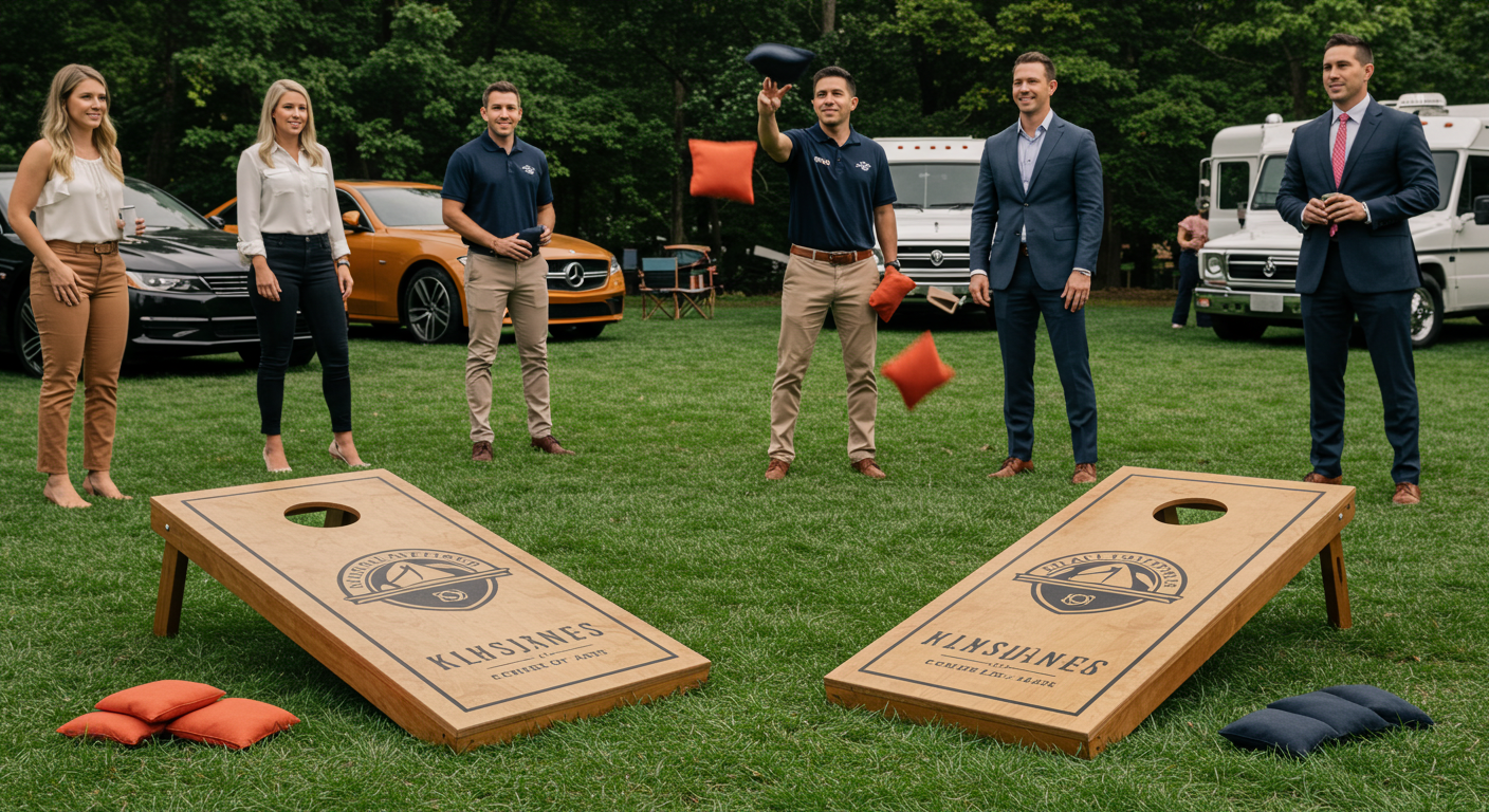 | Branded Cornhole | Trade Shows, Tailgates | Company logo, full color print | branded cornhole, custom lawn games, branded game |