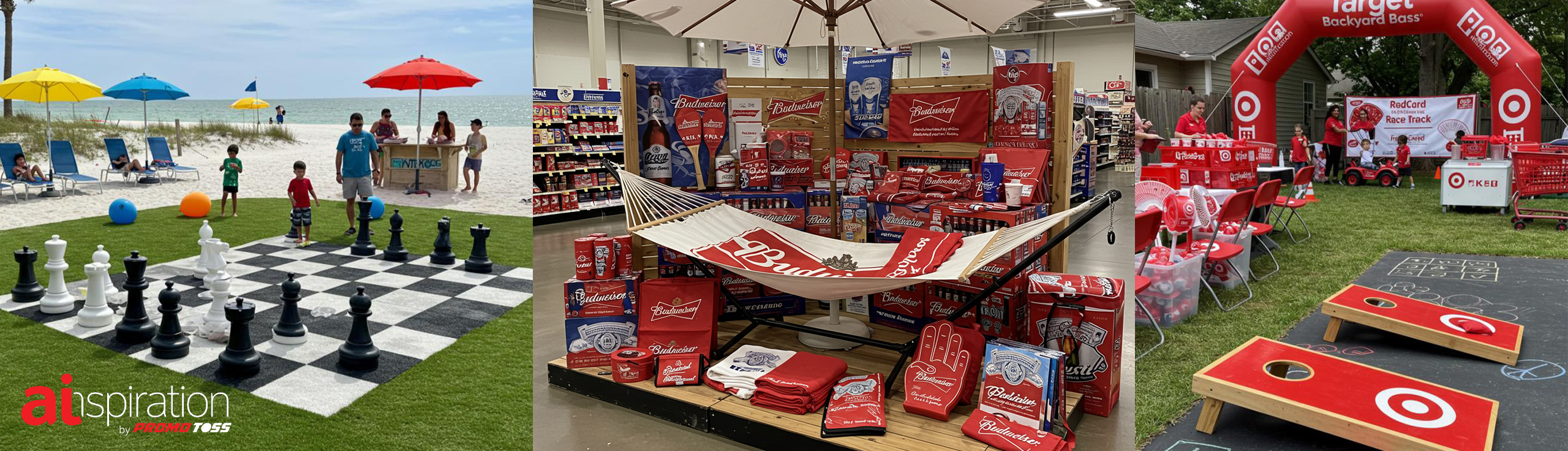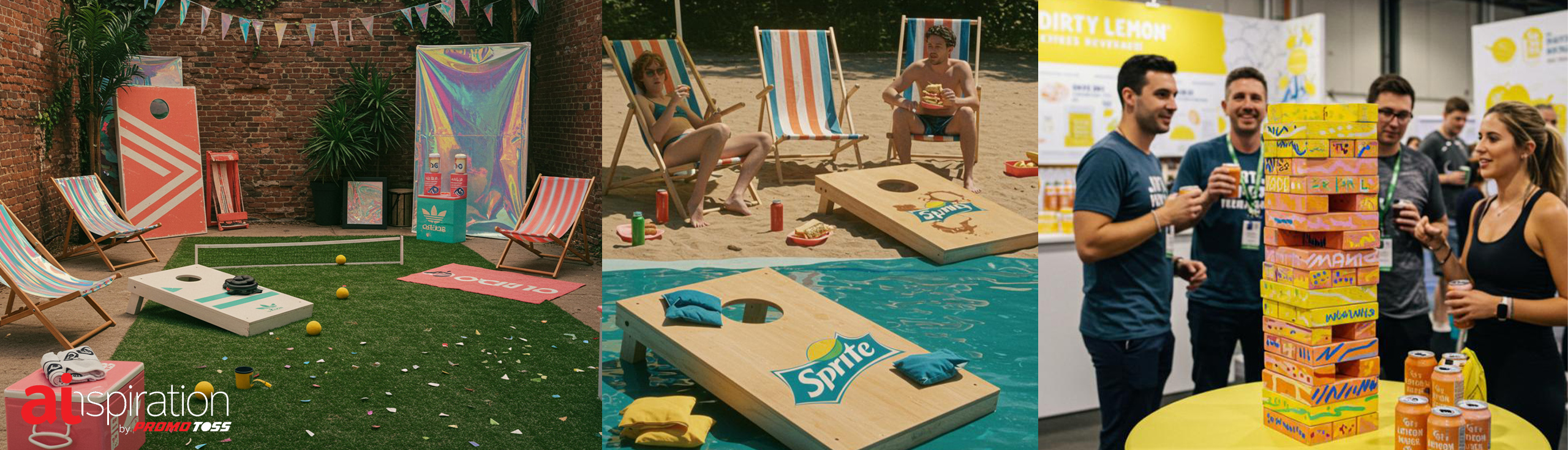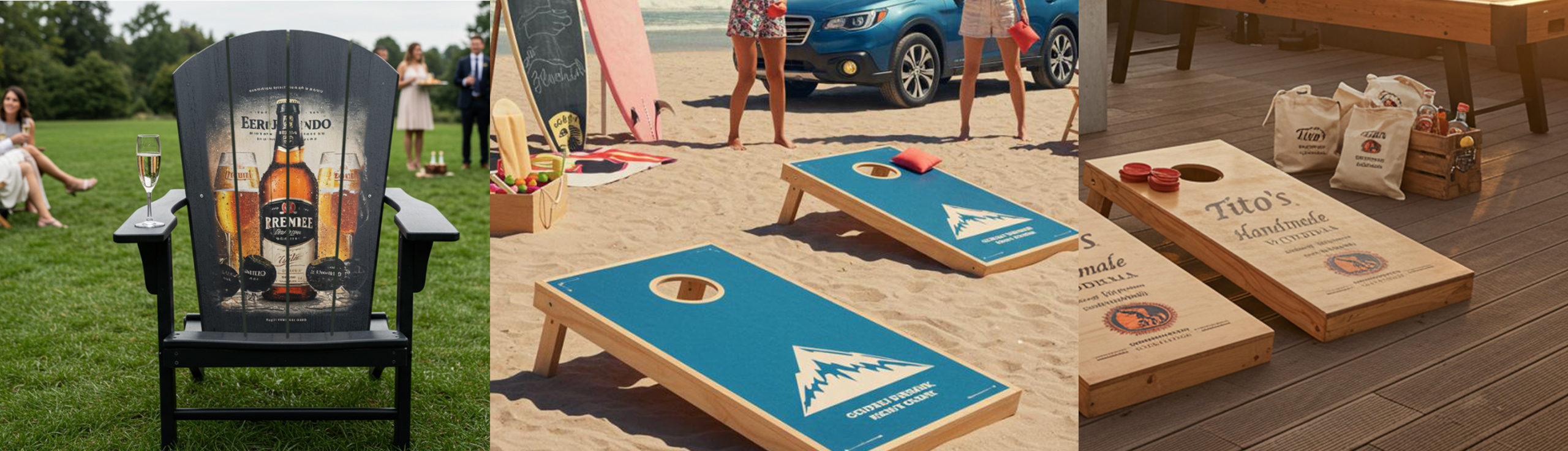 | Lawn Games | Festivals, Public Activations | Multiple pieces, full-color logo | custom lawn games, fun promotional games |
